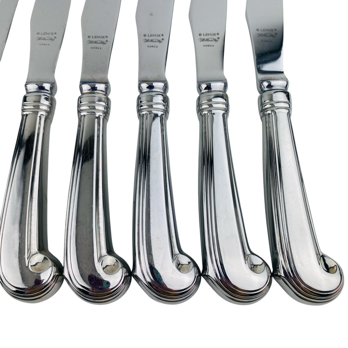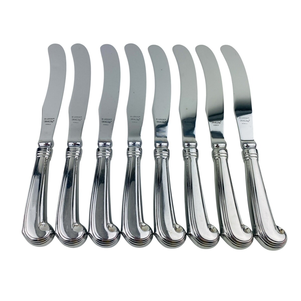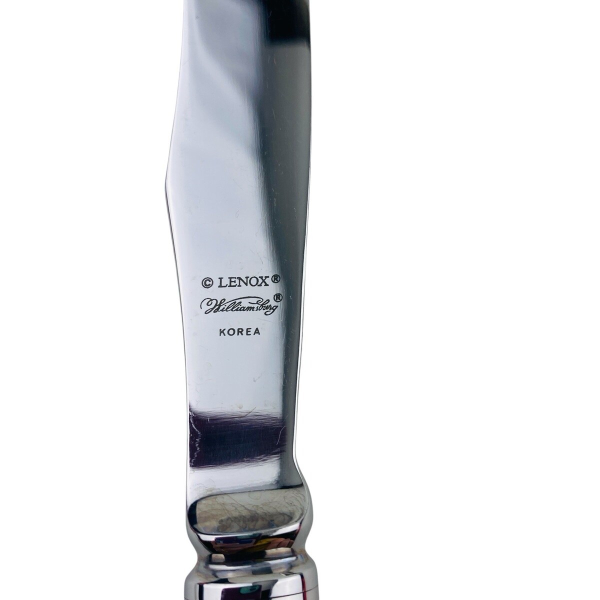 Set of eight Lenox Williamsburg Royal Scroll Old French Hollow Pistol knives. Each knife measures 9 7/8 inches long. Stainless steel, glossy finish, made in Korea. The knives are in very good preowned condition with light signs of use; please see pictures for exact condition details. Ships next day! Check my store for other Lenox Williamsburg Royal Scroll flatware replacement pieces.