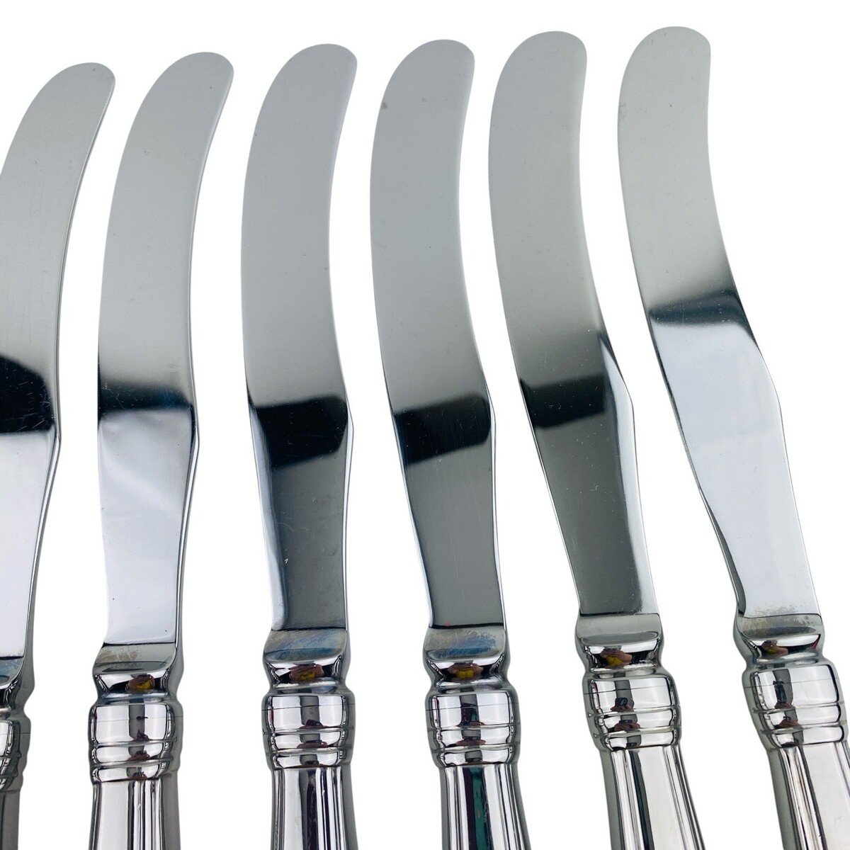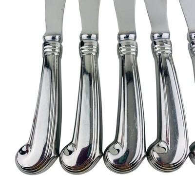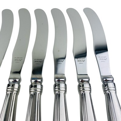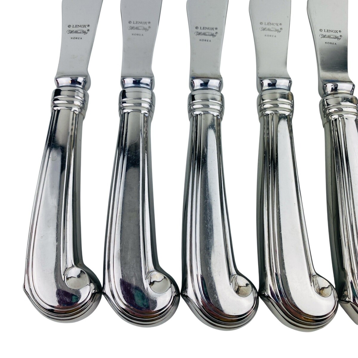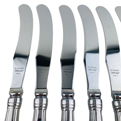 Set of eight Lenox Williamsburg Royal Scroll Old French Hollow Pistol knives. Each knife measures 9 7/8 inches long. Stainless steel, glossy finish, made in Korea. The knives are in very good preowned condition with light signs of use; please see pictures for exact condition details. Ships next day! Check my store for other Lenox Williamsburg Royal Scroll flatware replacement pieces.