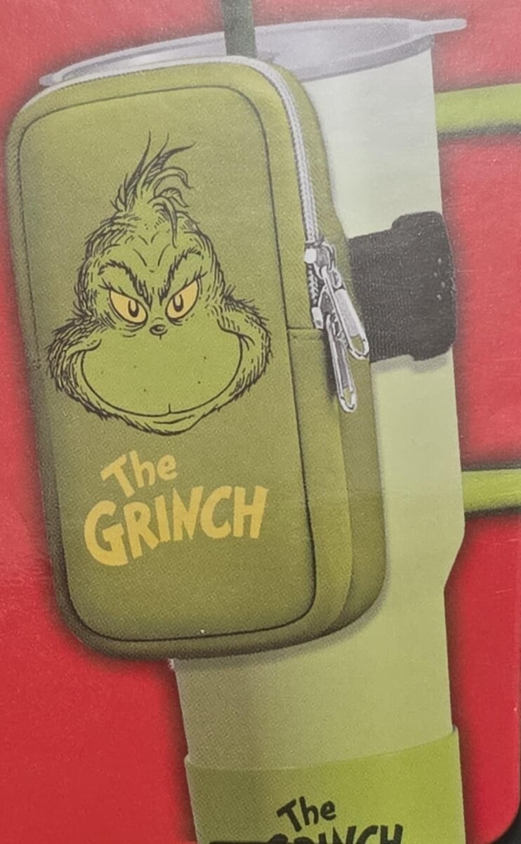 Deck out your emotional support water bottle for the holidays with this Grinch Tumbler Pouch! This cute tumbler accessory has a green body and displays a design of the Grinch's head with his name written in yellow text below him. Along the top is a zipper that allows you to keep loose change or lip balm inside. Simply attach it with its hook and loop strap to enjoy!