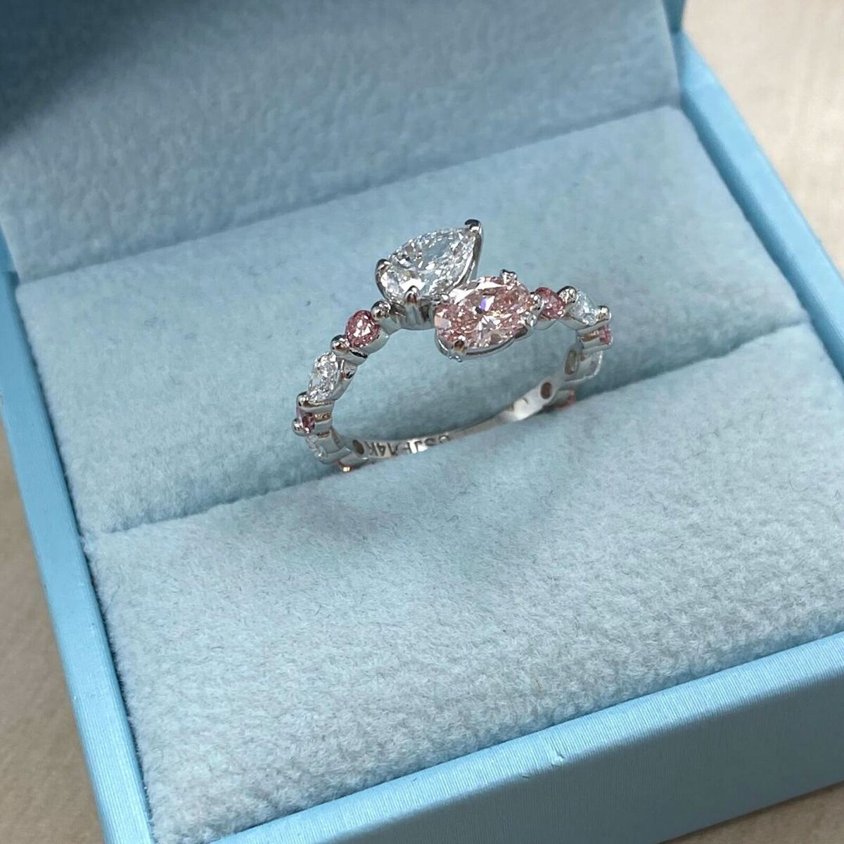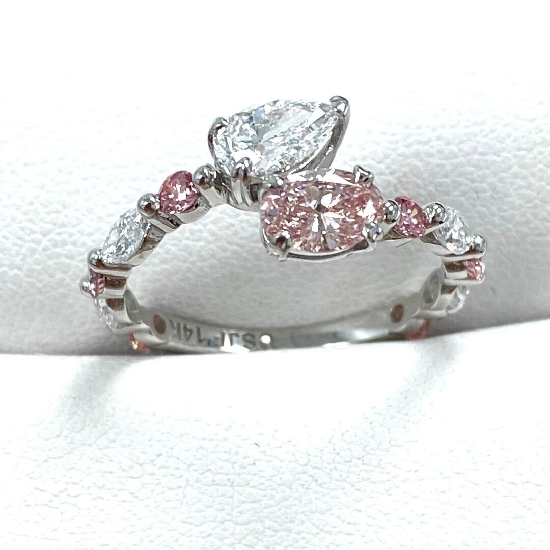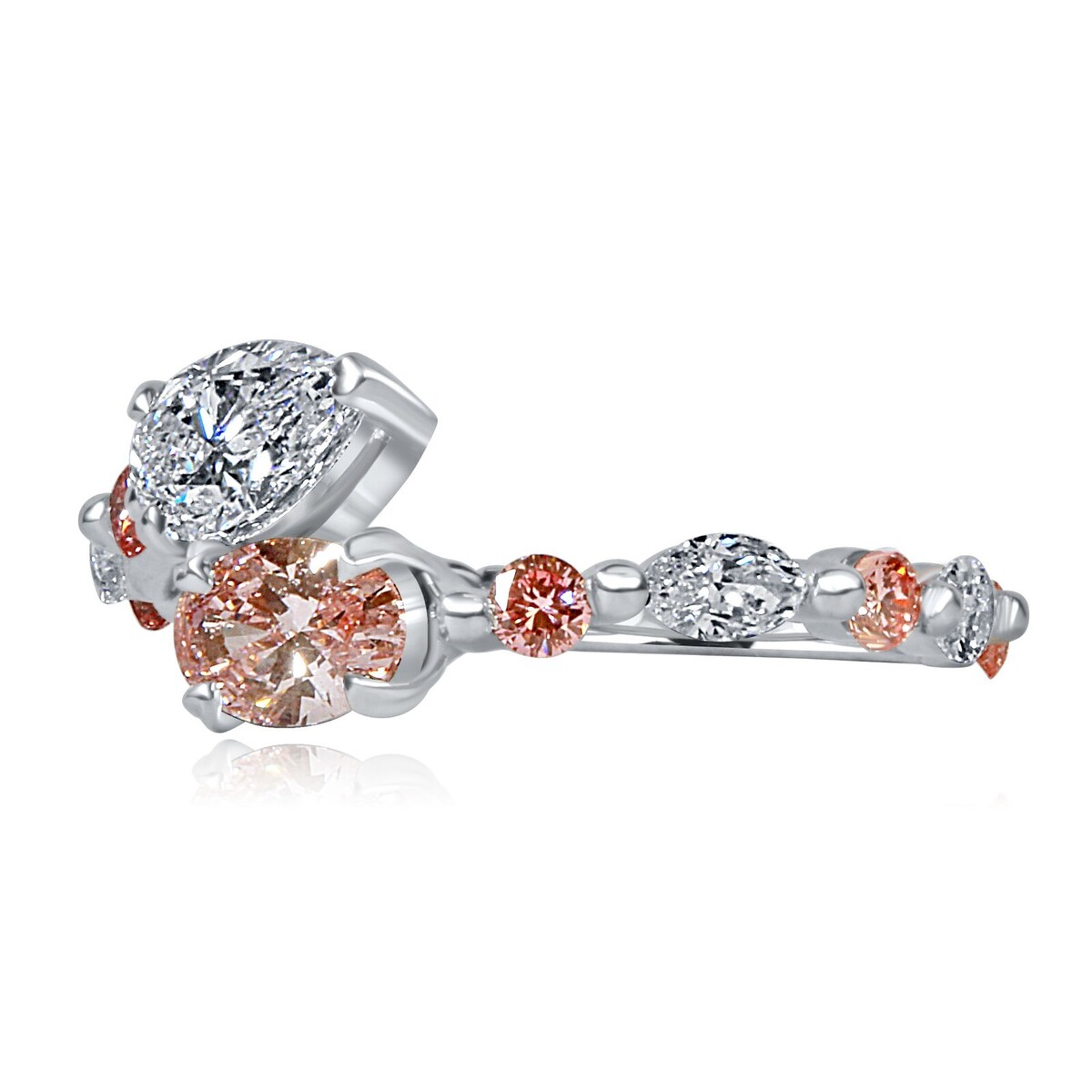 This modern bypass design diamond ring features 0.95 carat colorless pear and pink oval shaped lab grown diamond surrounded by of 0.69 carat round pink brilliant cut and colorless marquise brilliant cut lab grown diamonds in prong setting. Crafted of 14k white gold, the ring has a total diamond weight of 1.64 carats. The combination of pink and colorless diamonds, along with various cuts, creates a stunning visual effect, emphasizing the vintage Art Deco style!! The use of lab-grown diamonds ensures ethical sourcing while maintaining brilliance and quality! Our products are all hand made with quality and care, in the heart of the diamond district on 47th Street in New York City. Our dedication and commitment to fine work and quality exceeds all others. Since all of our products are handmad
