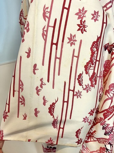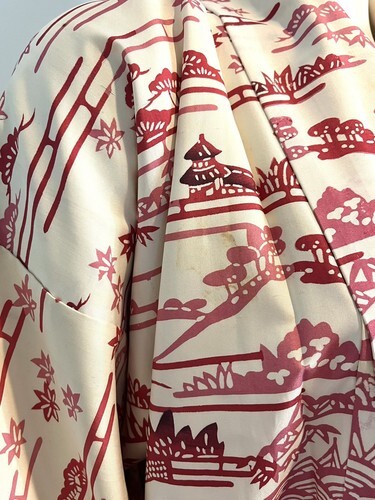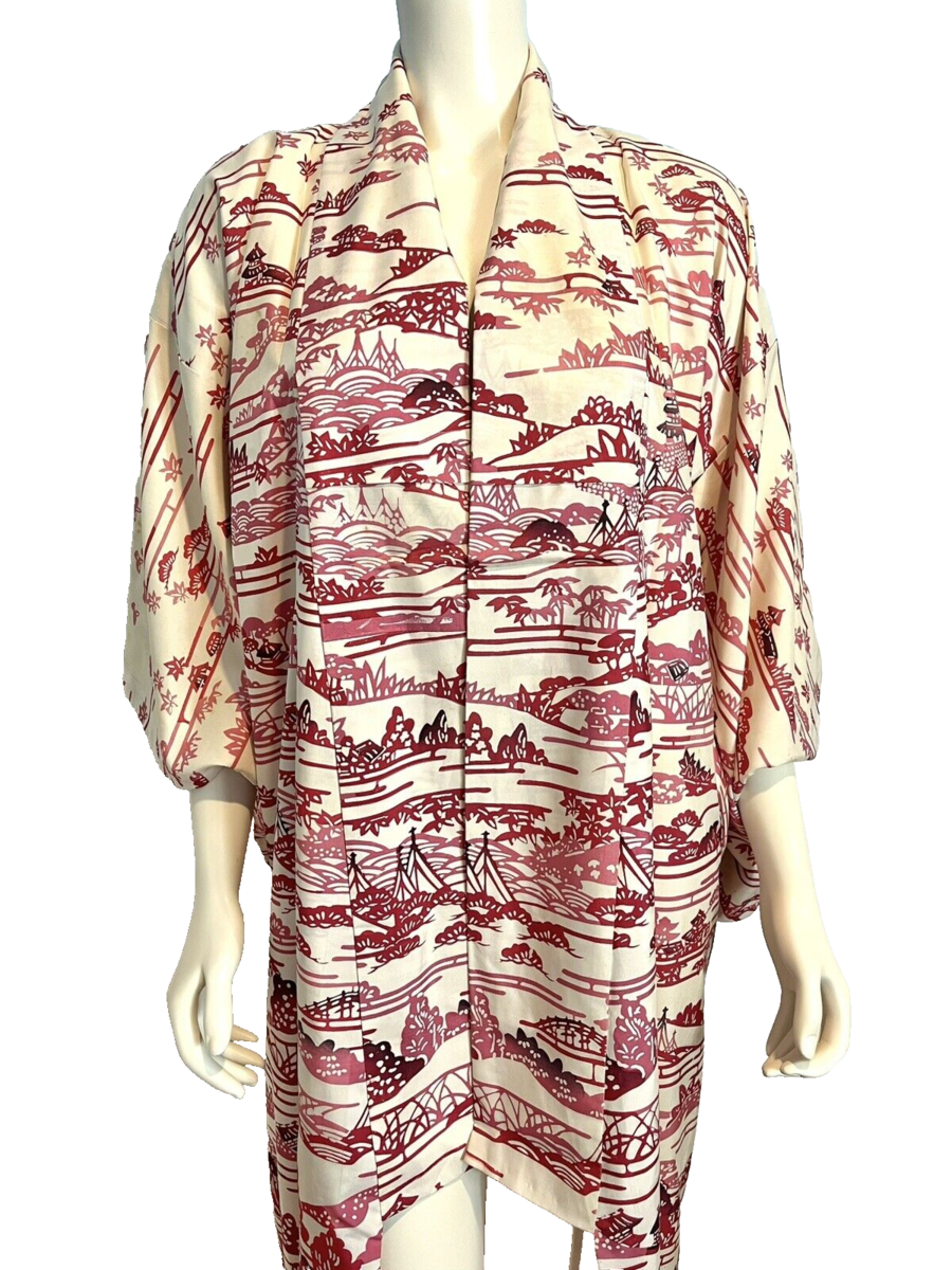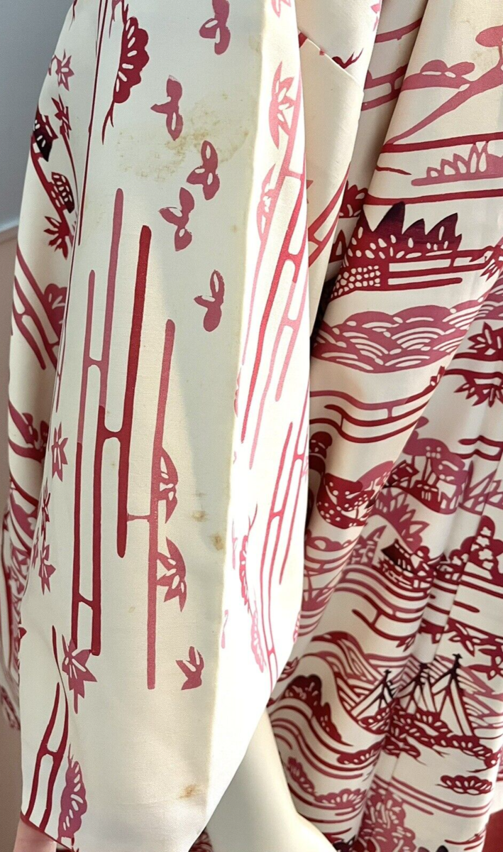 Japanese Silk Kimono Off White and Red Pagoda Print Full Length One Size