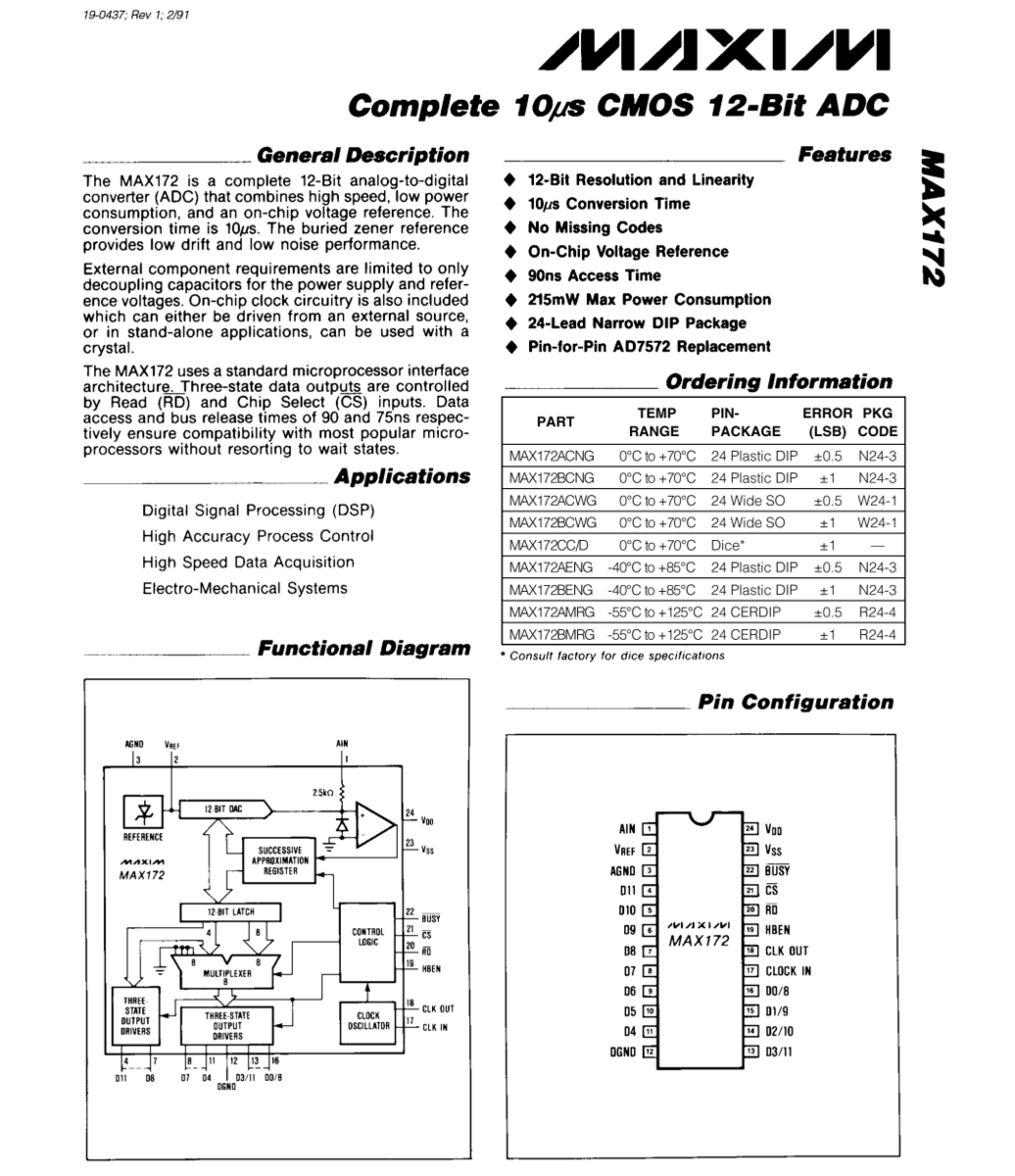 1X MAX172ACWG MAX172 MAXIM 10us 12-Bit ADC On-Chip Voltage Reference SOIC-24