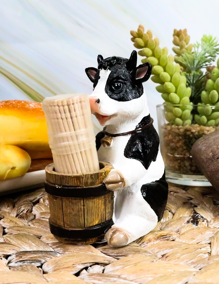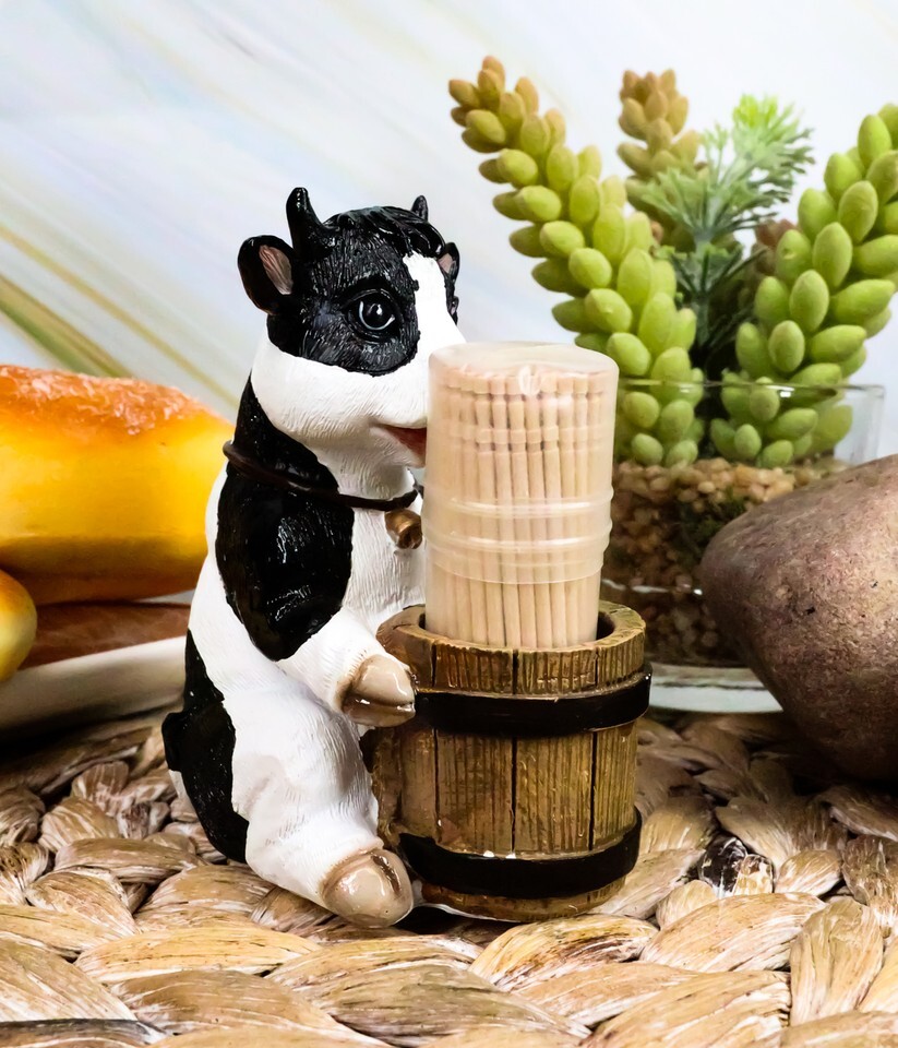Ebros Farm Bovine Holstein Cow By Wood Barrel Toothpick Holder With Toothpicks
