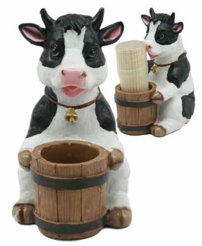 ? Get rid of that boring plastic toothpick container at your home and replace it with this pretty cow toothpick holder figurine! This farm cow with bell collar is hugging a wooden barrel that would perhaps usually contain jugs of cow milk. Beautiful craftsmanship and detail highlights this excellent figurine brought to you at a very affordable price!
