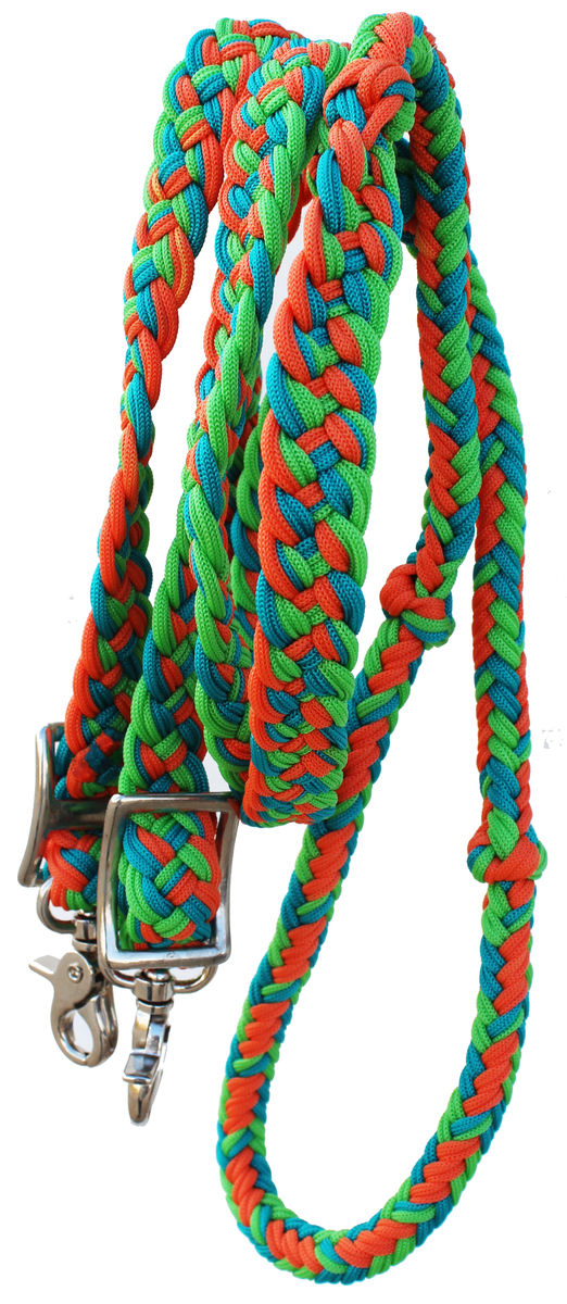 Easy grip knots give these reins no-slip security in the hands of the rider while the flat end braided nylon and conway buckle bit ends offer durability and adjustability. Available in multitude of colors! Features 2 stainless steel trigger snaps on both ends. Measures approximately 7-8 feet in length.