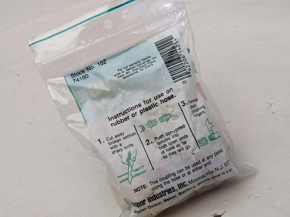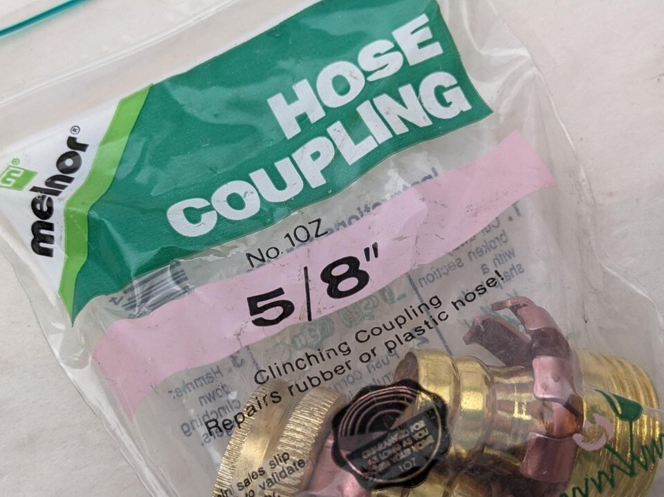 This is an ad for a new set of 2 pieces Melnor 5/8" Rubber Plastic Hose Clinching Coupling- Female End
