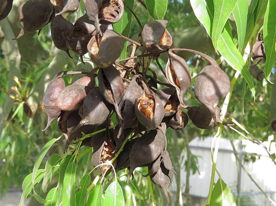 Fruit: After flowering, Brachychiton rupestris develops woody capsules that contain seeds. These capsules can persist on the tree for some time before eventually splitting open to release the seeds.