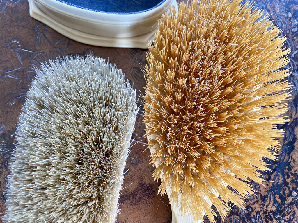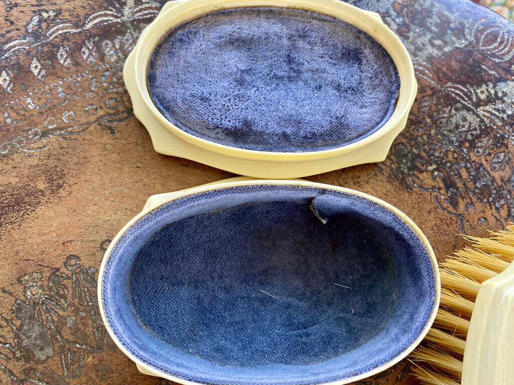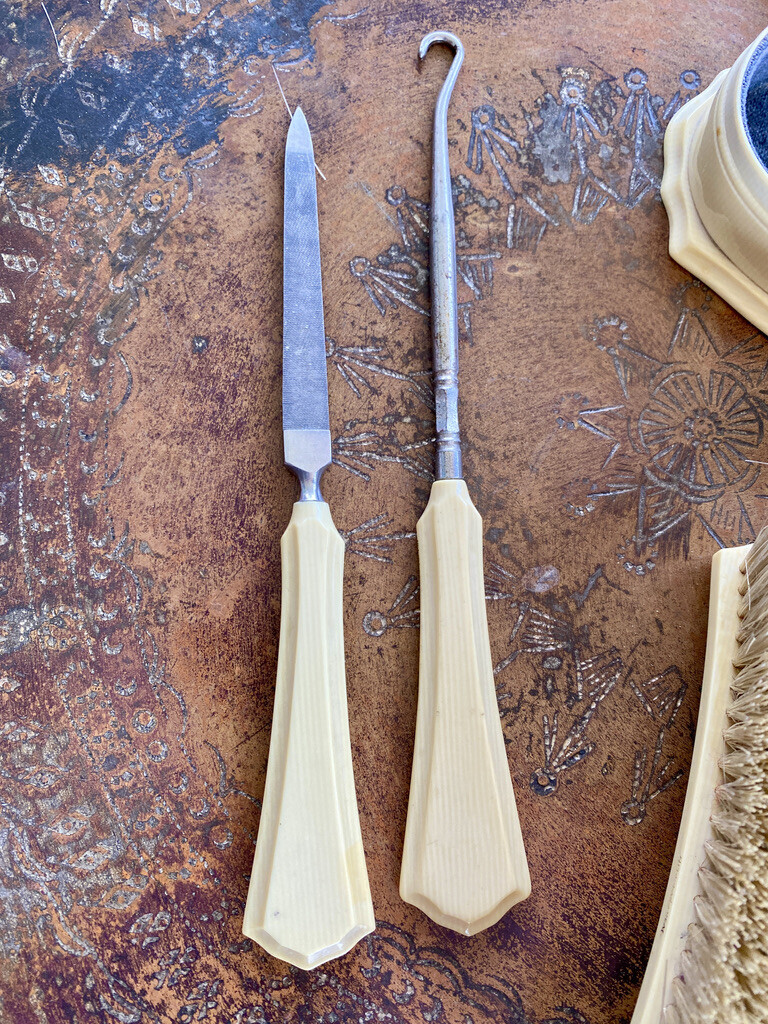 It is incomplete, but includes a hairbrush, a clothes brush, a nail file, a buttonhook, and a small Vanity box. Not warmed , chipped or cracked, or stained except the bottom of the covered box. The comb is ever so slightly a different shade but seems to match the style.