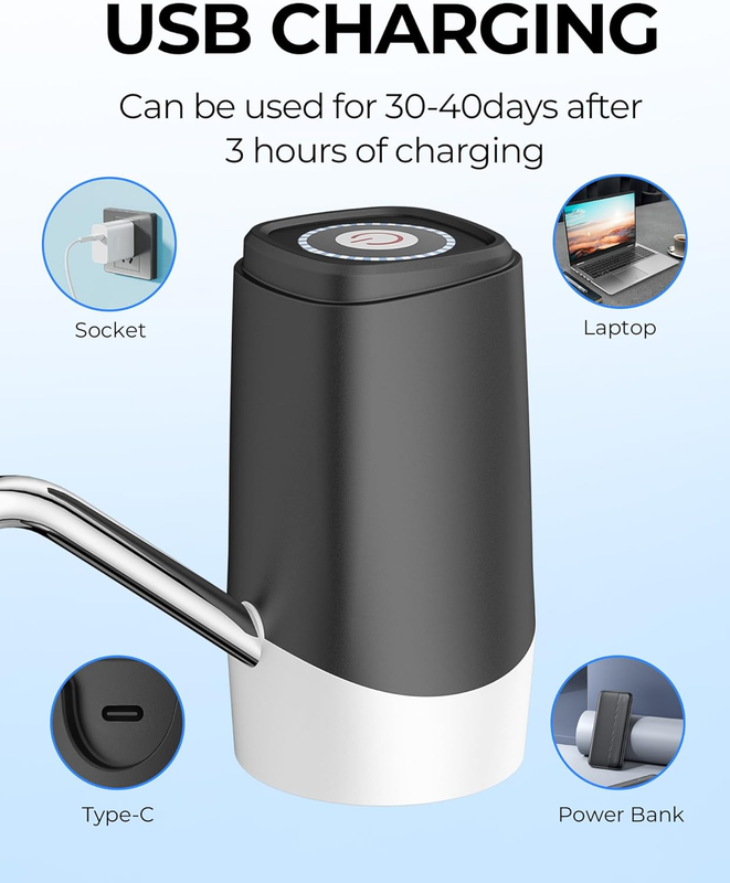 USB RECHARGEABLE: The water jug pump has a built-in rechargeable battery, supports charging via USB, no need to replace the battery frequently, convenient and practical.