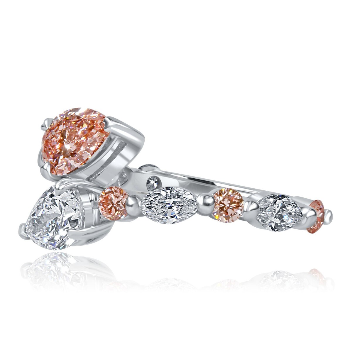 Celebrate the beginning of a beautiful life together with this pear brilliant cut lab grown white and pink diamond ring! This modern bypass design diamond ring features 1.12 carat 2 pear shaped lab grown diamond surrounded by of round brilliant cut and pink diamonds in prong setting. Crafted of 14k white gold, the ring has a total diamond weight of 2.02 carats. The bypass ring is the perfect alternative to the classic engagement ring.