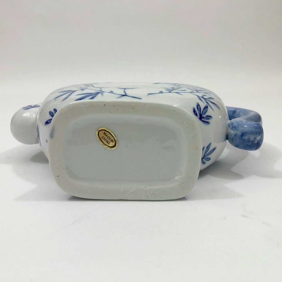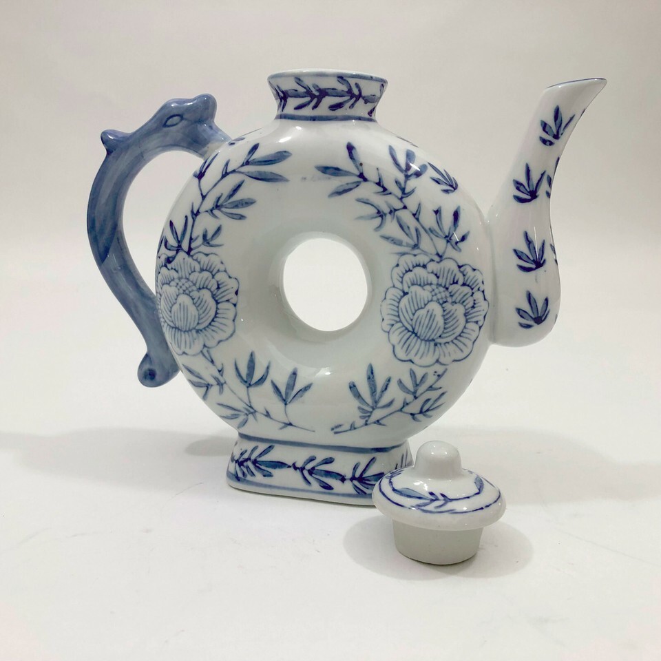 Asian Blue & White Donut Shape Porcelain Teapot Floral with Dragon Handle