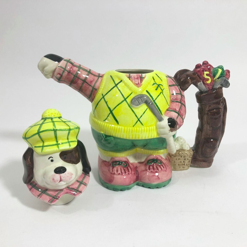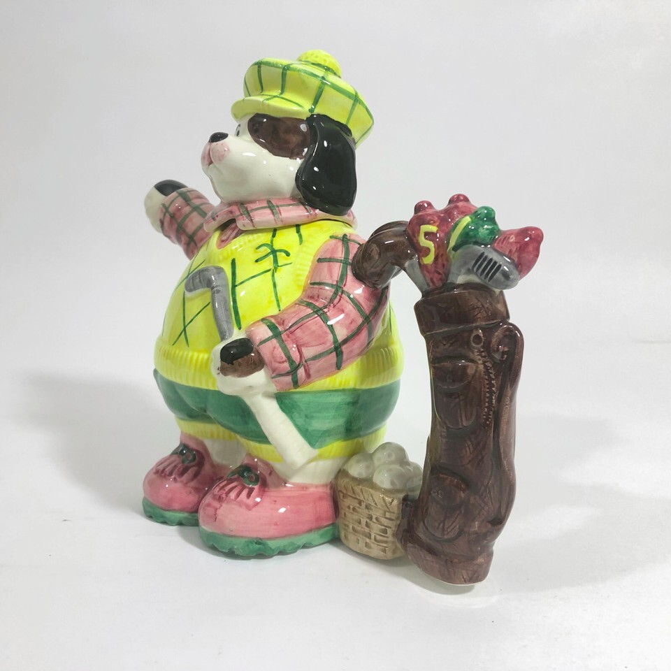 A cute dog is dressed for golfing. He has a golf club in one "hand." And his other arm is the teapot spout. His hand at the end of the spout is holding a golf ball. The handle is a golf bag. And there is a basket of golf balls next to the bag. It is in excellent used condition. The numbers on the golf bag have some over paint. Remember it was hand done. Use is as a teapot or as a fun decor piece.