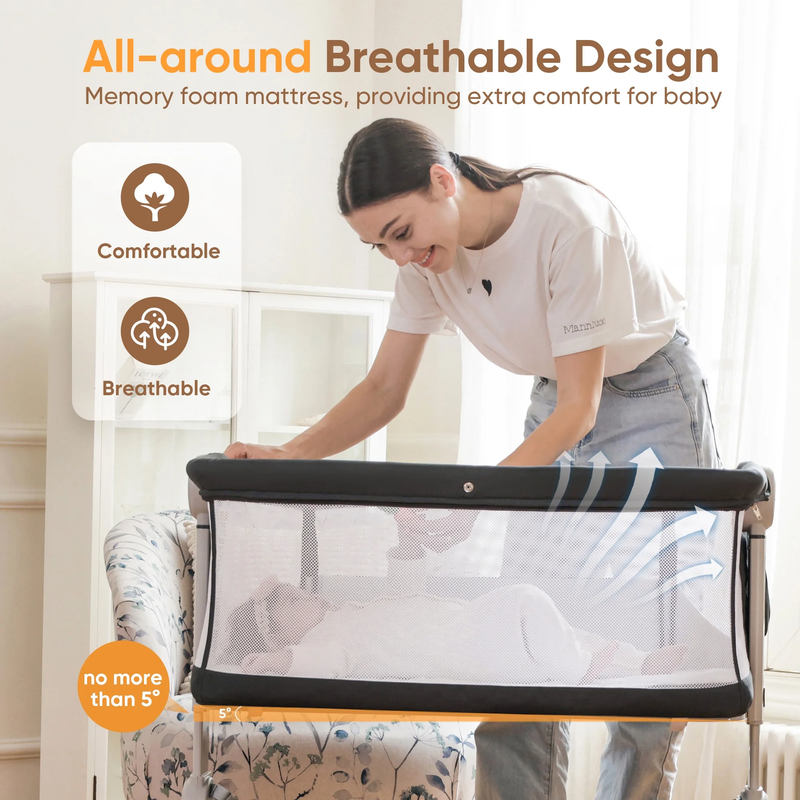 ??3-in-1 Multi-Functional Design?The 3-in-1 bedside bassinet combines a baby crib, bedside sleeper, and standalone crib with a mosquito net. The breathable mesh ensures your baby?s comfort and safety. A side zipper design allows easy mode switching for feeding and sleeping needs. Movable and lockable, it provides both convenience and security. It can be attached to an adult bed and easily transformed to meet different needs.