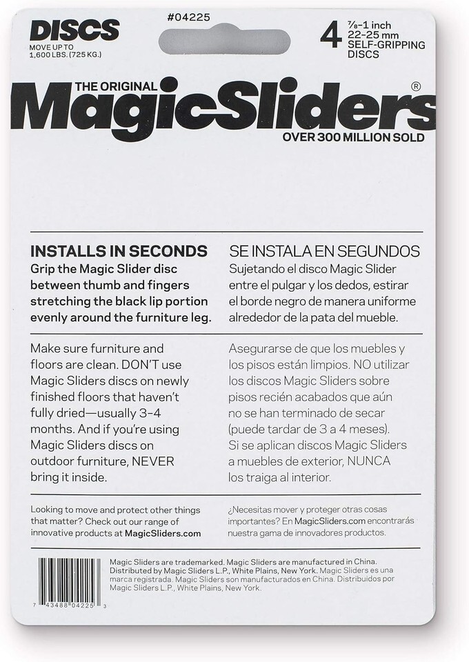 Protect your floors and effortlessly move heavy furniture with Magic Sliders 04225 ? premium round furniture glides designed for smooth, scratch-free sliding on hardwood, tile, laminate, and carpeted surfaces. Each 7/8-inch diameter gray glide features a proprietary high-tech polymer coating that virtually eliminates friction, allowing sofas, chairs, tables, and cabinets to glide with minimal effort. The 4-pack includes strong double-sided adhesive backing for quick, secure, no-tools installation on furniture legs or bases.