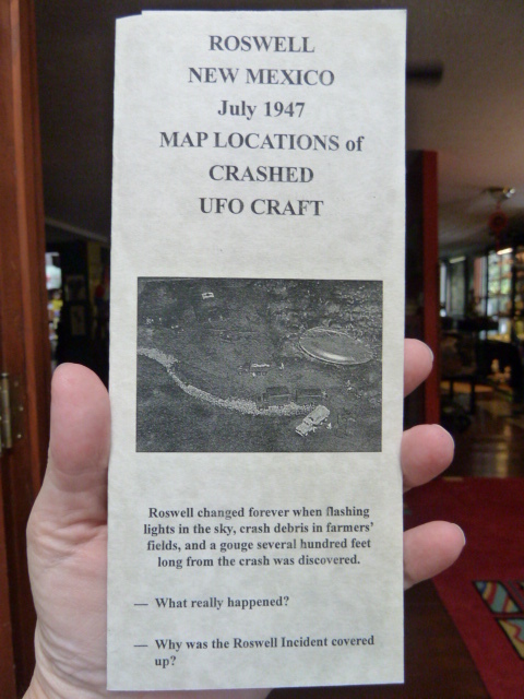 #A-51 Great collector's item for the Area 51/Roswell/X-files buff! Top quality, Guide to Roswell 1947 UFO Craft crash sites has a map directions of the 6 original locations of crash debris, along with an excellent description of The Incident. Tri-fold 8-1/2 x 11" brochure designed EXCLUSIVELY by and for us, PACKED with researched information, a photo diorama of a crash site, photo of the Roswell Daily Record newspaper front pages, 3 photos of the alien autopsy and MORE.