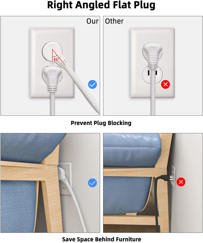 ?Right Angle Flat Plug Design? The 45 low profile flat plug design won?t block the adjacent lower outlet, and can be easily placed placed on the wall plug behind the bedside table, bed, table and other furniture.