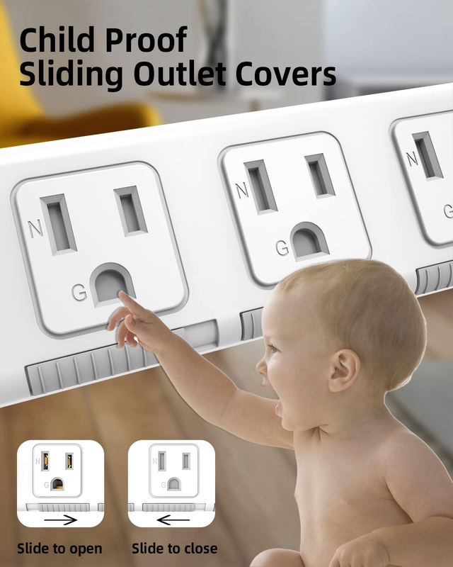 ?Child Safety Sliding Outlet Cover?Each outlet of this portable power strip set with a slide-to-lock cover, protect baby away from accidental electric shock and keep unused outlets closed from dust even a little water. Help quality parents better protect their children from power accidents.