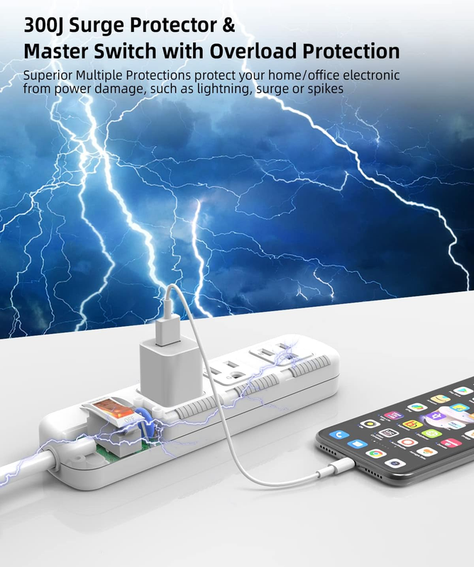 This power strip surge protector has a built-in circuit breaker to safeguard your expensive devices and your home. If the power load exceeds 10A/1250W, the switch will trip off automatically to protect your devices and your home.