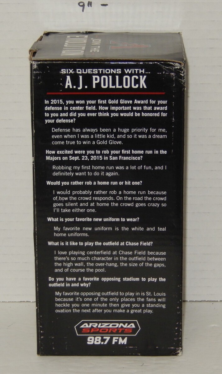 For Sale is a 2016 A.J. POLLOCK Bobblehead SGA Arizona Diamondbacks MLB Baseball Bobble head. it in good condition as seen in the pictures provided what you see is what you will receive. Please ask Any and All Questions prior to purchasing. Fast Same or Next day shipping with Free Delivery Confirmation within the U.S. Payment Due within 7 days of purchase (if you need more time please let us know In advance) we love to combine shipping is always a Yes and Most of the time Additional Items Ship for free.