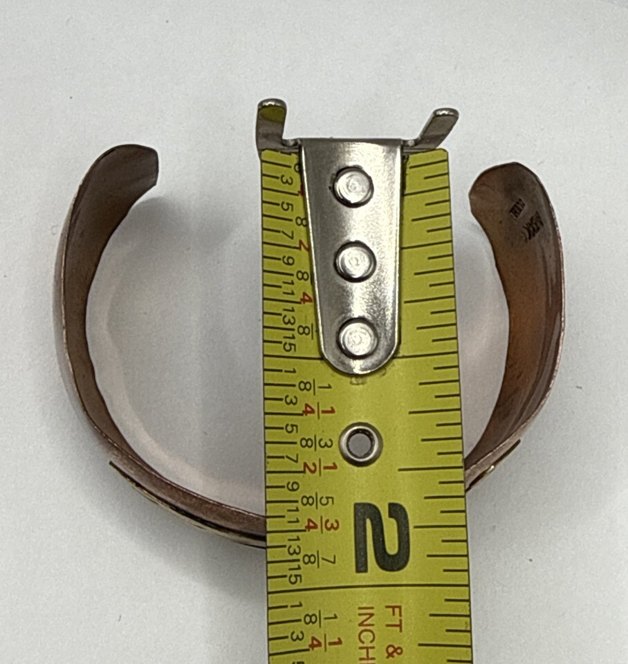 This Vintage Cobre Mexico Copper and Abalone Mixed Metals Bracelet is a beautifully crafted cuff style piece featuring copper as the base metal. The bracelet showcases a unique design with a mix of copper and abalone shells, creating a rich brown color with multicolor accents. The craftsmanship and combination of materials make this piece a standout piece of vintage jewelry, perfect for adding a touch of Mexican flair to any ensemble.