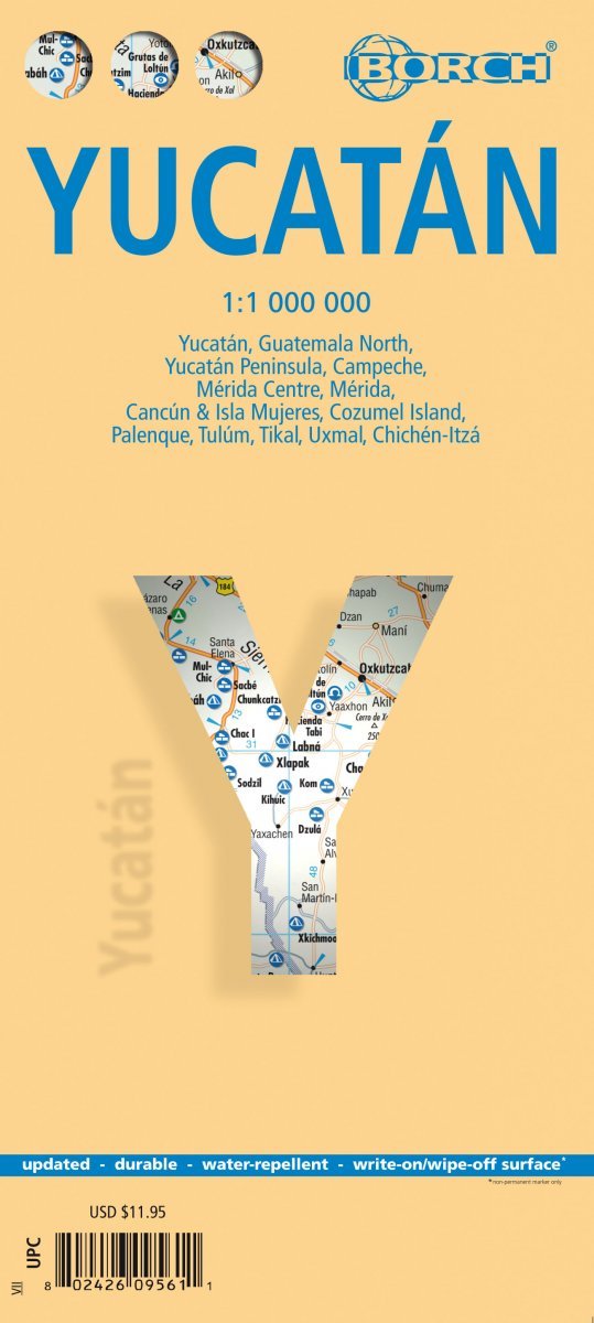 Our folded roadand travel map of Yucatanincludes topsights,monuments, religious sites, point of interests,beaches, camping sites. The colored map includes insetsof Guatemala North, Yucatan Peninsula, Campeche, Merida Downtown andMerida, Cancun andIsla Mujeres, Palenque, Tulum, Tikal, Uxmal, Chichen-Itza andCozumel Island.Climate charts show the average daily temperatures, humidity, hours of sunshine and precipitation for each month.These Borch mapsare durable, water-repellent and feature a laminated write-on/wipe off surface and measureapproximately 9.5"x4.5" when folded up and unfolds into a flat double-sided map measuring 34"x19.25".