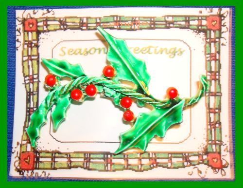 This is a VINTAGE Green Holly Sprig Pin. This also has 7 enamel Red Holly Berries. Great/Excellent condition. No tarnish or wear on this pin. Doesn't look like it's been used.