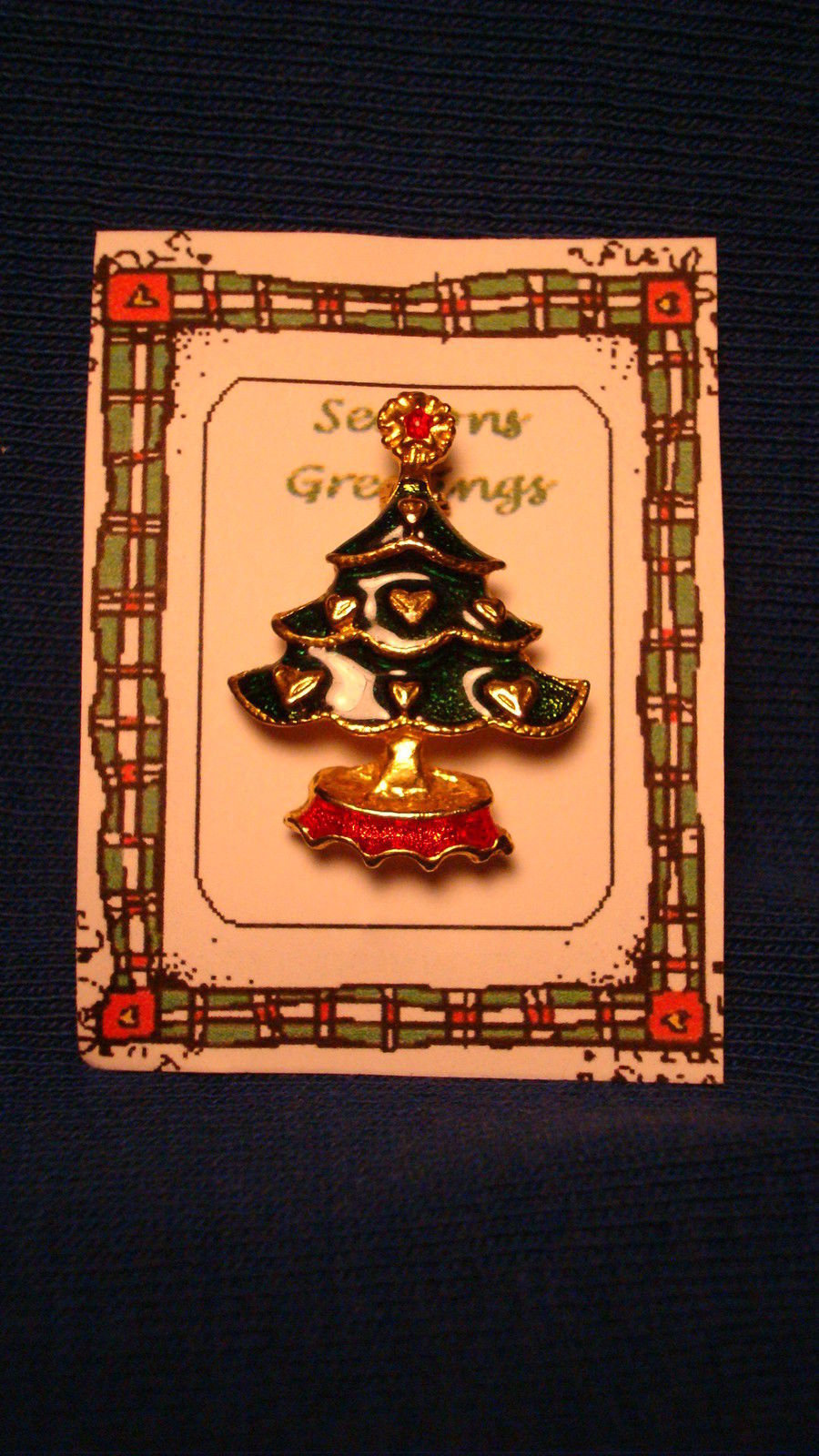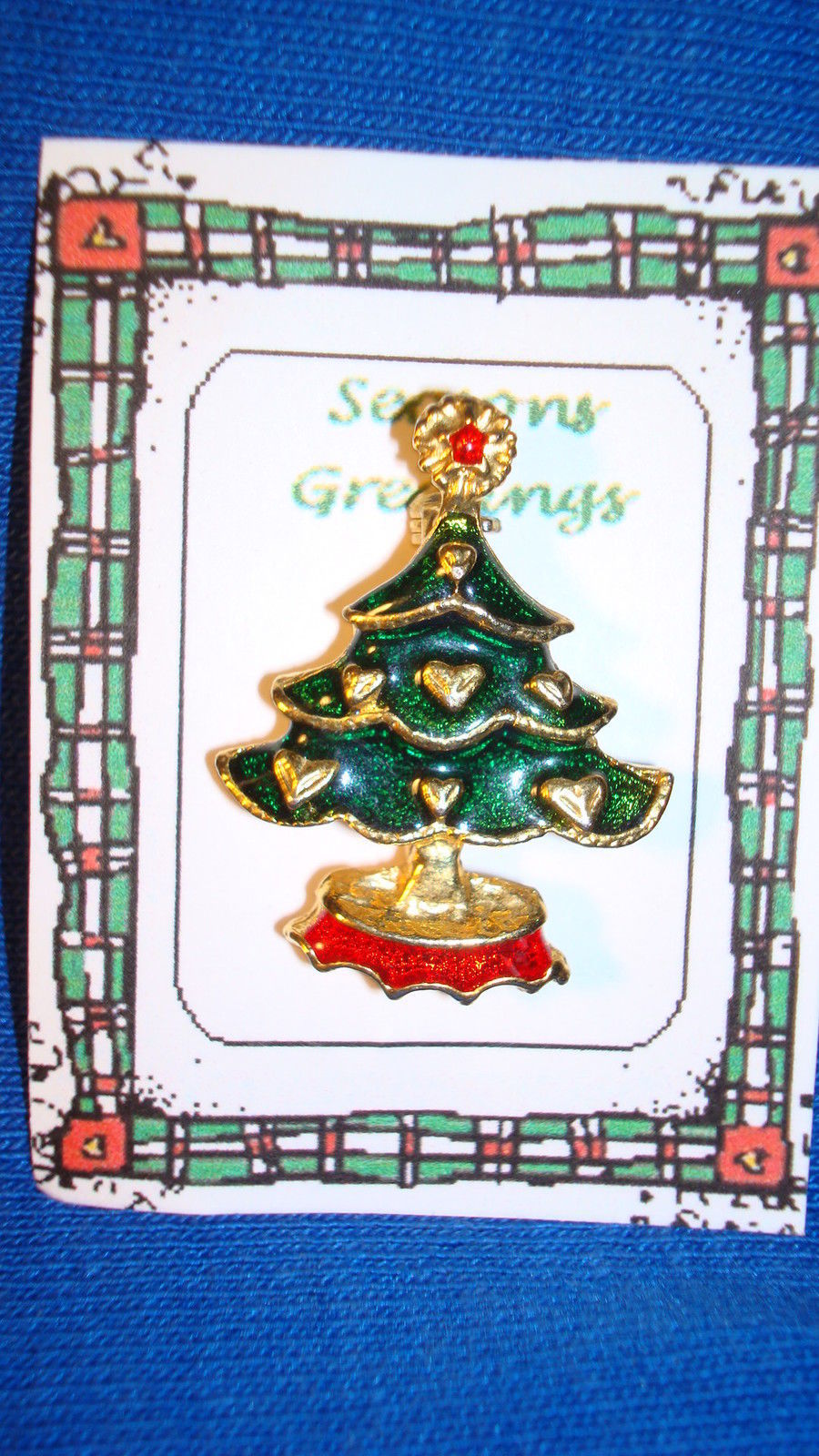 This is a very pretty Green Christmas Tree PIN. It's a Decorated Green Christmas Tree with a Red Top and Red Base with Gold HEART ornaments.