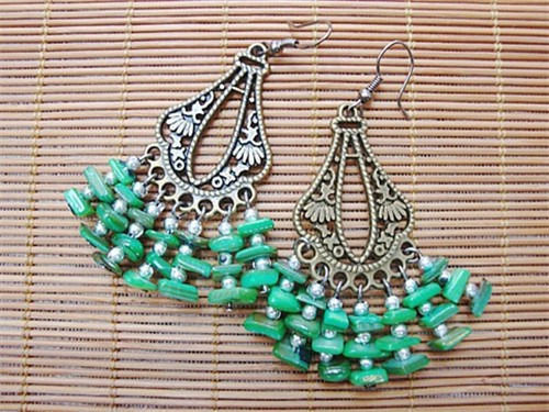 Tibetan Brass Plate 7 Imitation Green Turquoise Beaded Dangle Earrings
