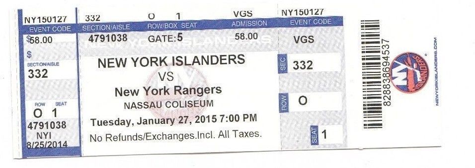 2015 NY ISLANDERS VS NY RANGERS FULL TICKET AND STUB 1/27/15 NASSAU COLISEUM LOT