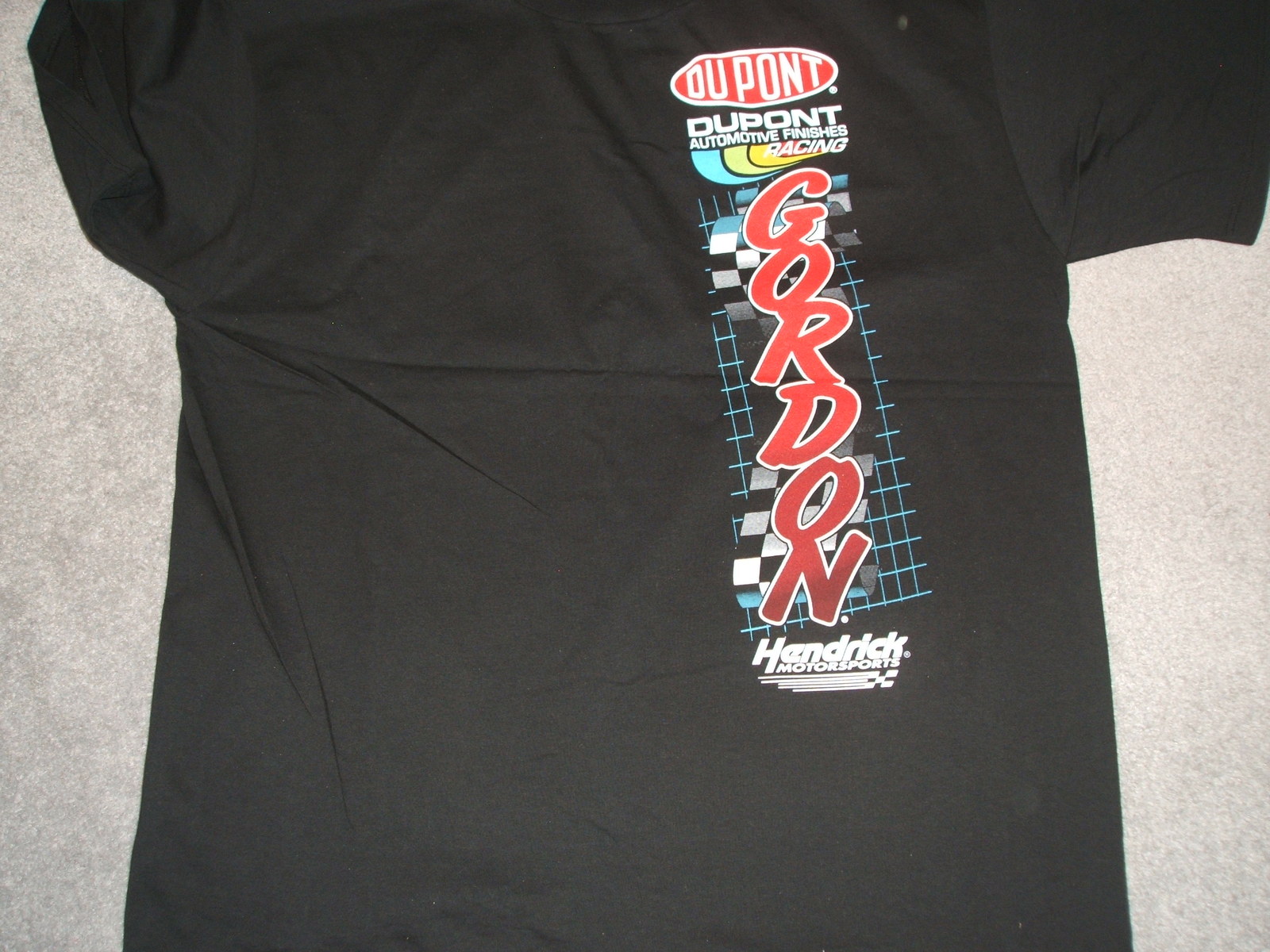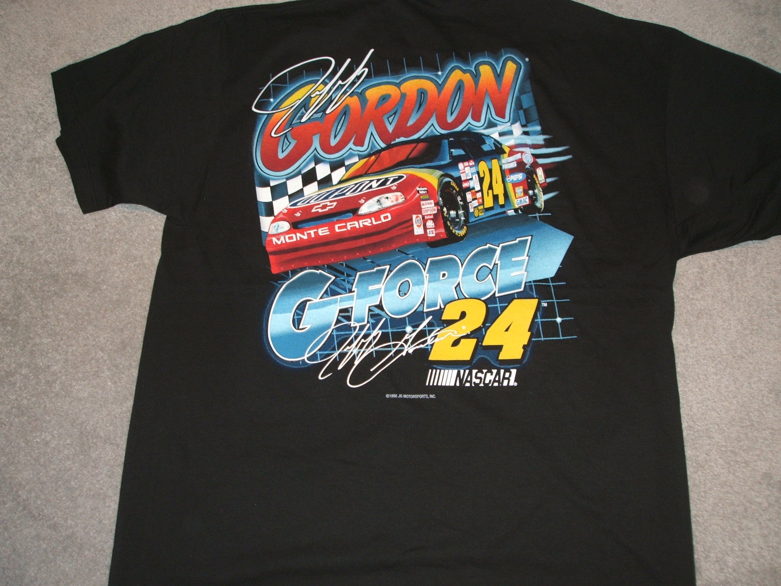 Jeff Gordon #24 Chevy DuPont Motorsports "G-Force" on a new XXL black tee shirt. This is a two-sided print that shows the #24 car with Jeff's signature last one.