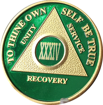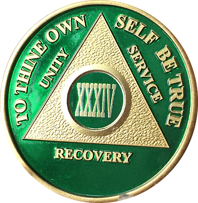34 Year AA Medallion Green Gold Plated Alcoholics Anonymous Sobriety Chip Coin