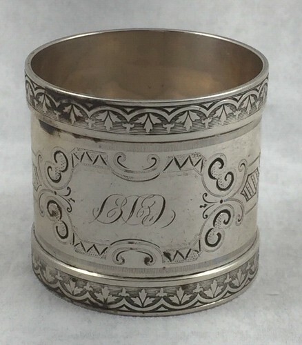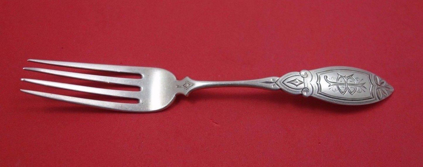 Vanderslice coin silver Junior Fork Bright-Cut Dated 1874, 6 1/8". It is monogrammed (monos vary) and is in excellent condition.