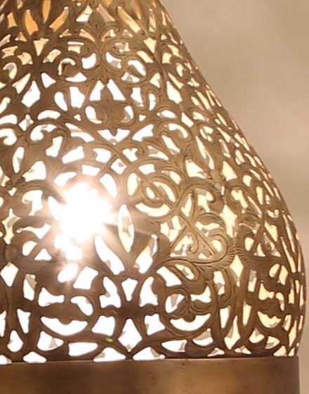 Our antique brass Engraved pendant lamp is perfect for smaller spaces. Its shape allows for plenty of clean light to project as well as a subtle patterned light to emit through its floral design. This small cone shaped Moroccan ceiling light has been pierced by hand, using a fine blade fretsaw tool to create intricate patterns that really catch the eye.