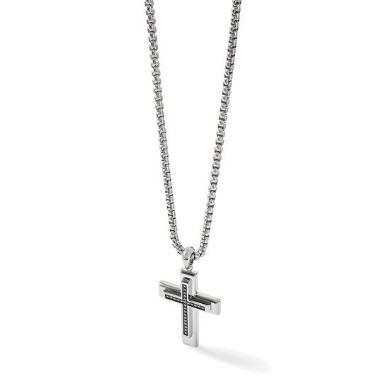 This exceptional designed cross is constructed with high quality Stainless steel. This simple yet elegant cross pendant gleams with a high polish finish and black cubic zirconia accents. The stainless steel box chain measures 22 inches in length and 3.1mm in width. An easy-to-wear Lobster Claw clasp completes the look with a secure and comfortable fit.