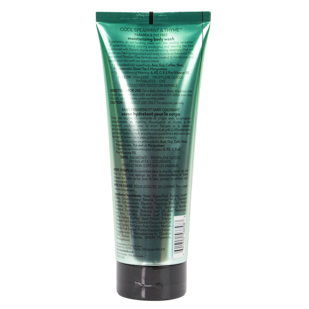 Treat yourself to luxurious lather with Cool Spearmint Thyme Moisturizing Body Wash by Vitabath. Experience an exhilarating clean with the cooling sensation of spearmint, mind clearing eucalyptus and reviving tea tree combined with French thyme and refreshing rosemary that will leave you feeling invigorated and ready to take on the world!