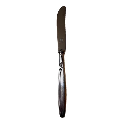 Silverplate hollow handle with blunt blade Dinner Knife 10 1/2" in the pattern Thistle by Art Krupp / Berndorff Metal Co. It is monogrammed (monos vary) and is in excellent condition.