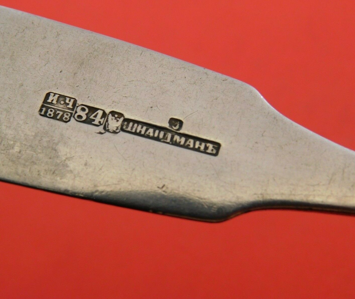Russian sterling silver Dinner Spoon 8 1/2" (Kamianets-Podilskyi) circa 1878 (maker unknown). The assayer was Ivan Tschertenkoy. It is not monogrammed and is in excellent condition.