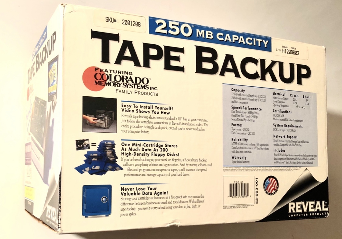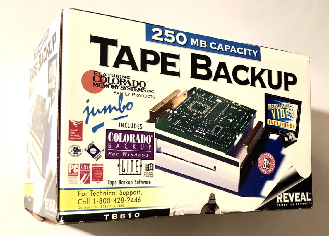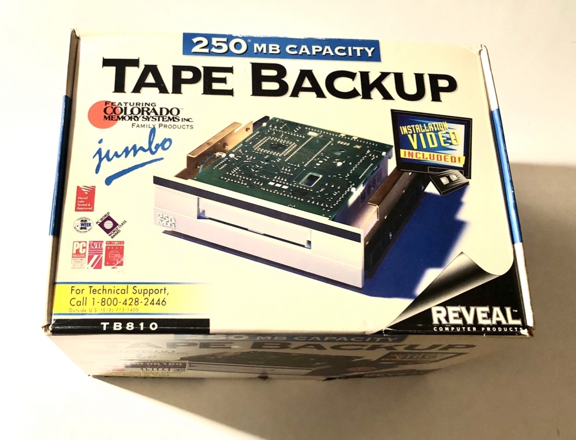 A vintage Reveal Computer Products 250 MB Capacity Jumbo Tape Backup in Original Factory Pacageing and featuring Colorado Memory syatems Inc. Family Products.