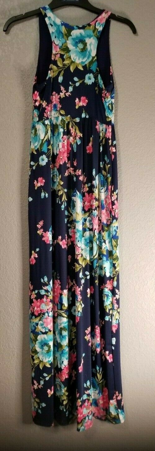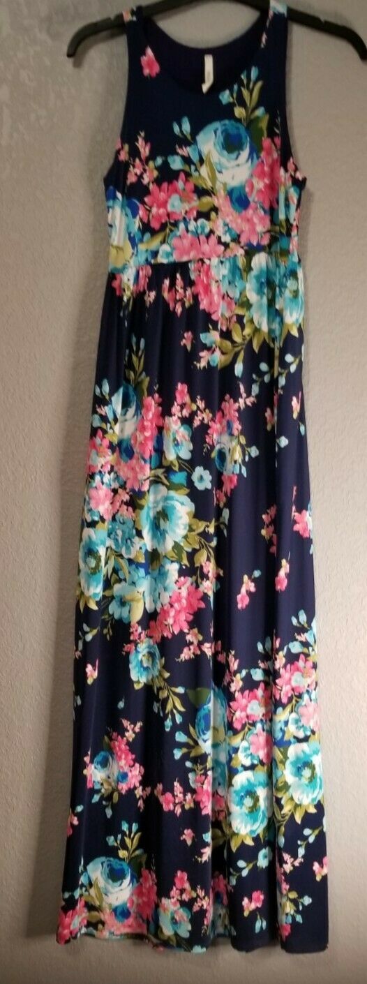 LIKE NEW! Beautiful, easy to wear! Measures 13.5 under arm x 54 Long. Bella Blue Floral Long Tank Dress with Pockets size S. Condition is Pre-owned. Shipped with USPS First Class Package.