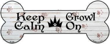 Keep Calm Growl On Novelty Bone Magnet B-046. 3.5" x 9" High gloss metal novelty Bone Sign Magnets. Made of the highest quality aluminum for a weather resistant finish. It is lightweight and durable. Equipped with two magents on the back of the plate.
