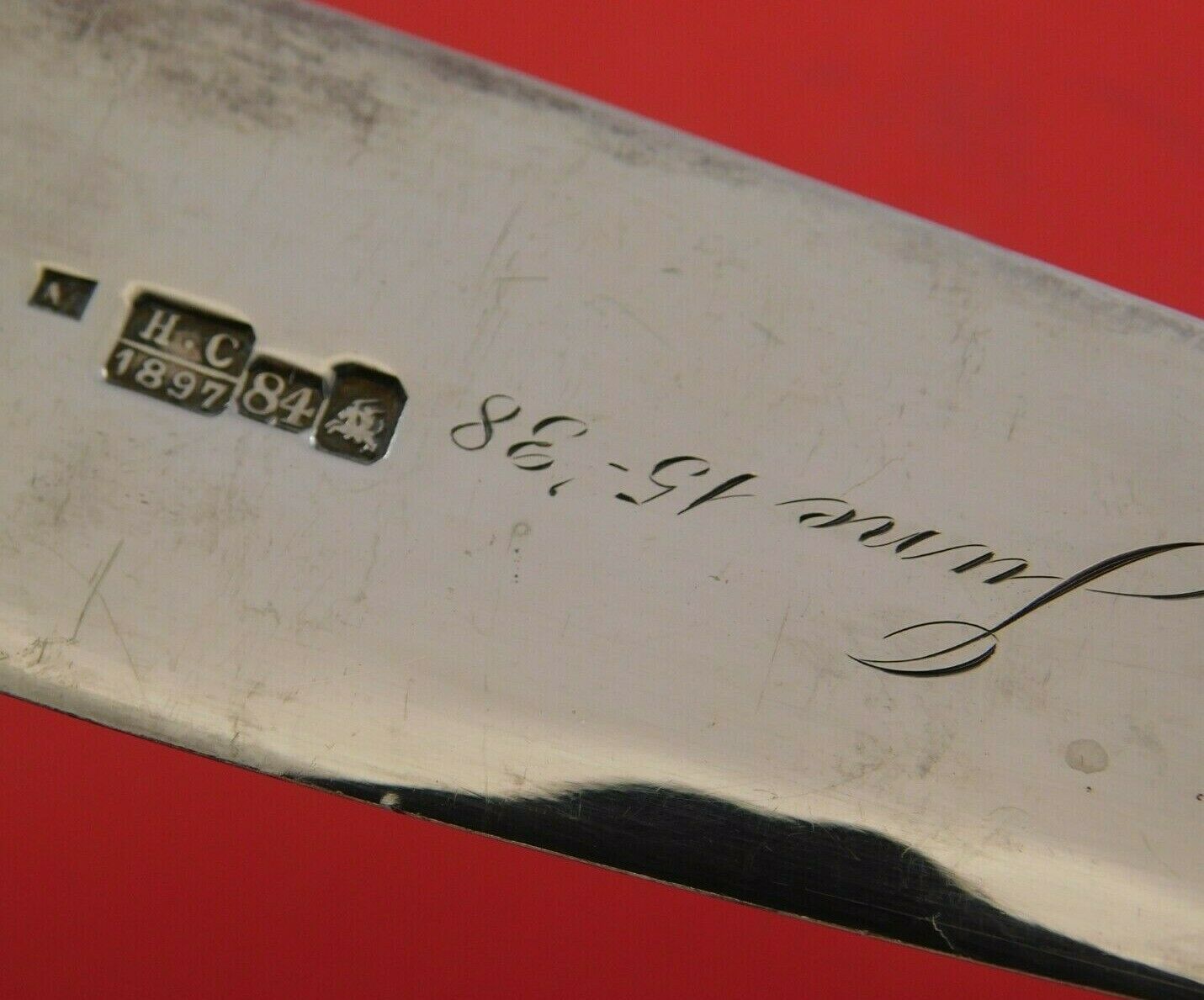 Russian .875 silver Soup Ladle Gold Washed 13 3/8" (maker unknown). This piece has a date mark for 1897. It has a monogram on the front and an inscription on the reverse (see photos). It is in excellent condition.