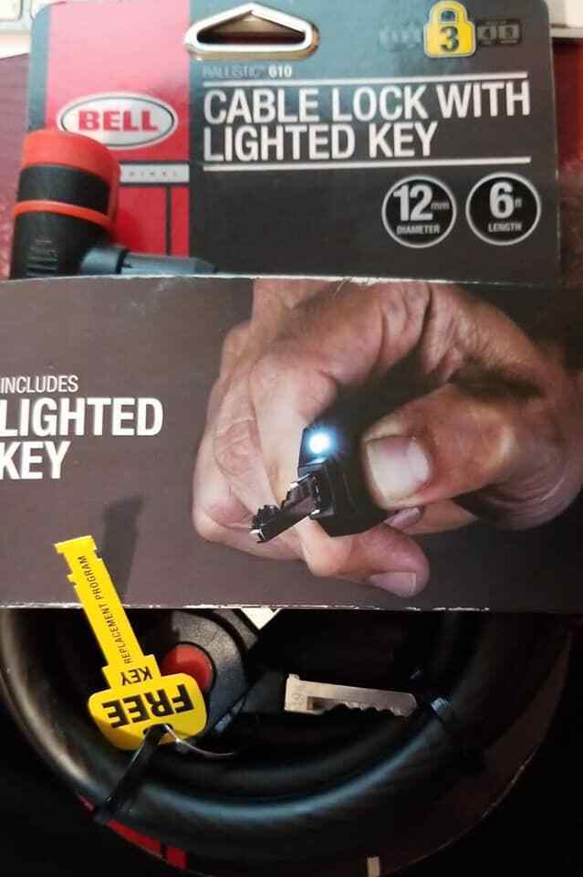 The Bell Ballistic 610 cable lock with lighted key features 6ft-x-12mm HD steel cable with thicker, stronger HD steel that provides significantly more cut strength than the previous model. A dust cover protects key chamber from the elements. One standard key and one lighted key included, with free standard key replacement. Two CR1220 batteries included for lighted key. Security level rating: 3.