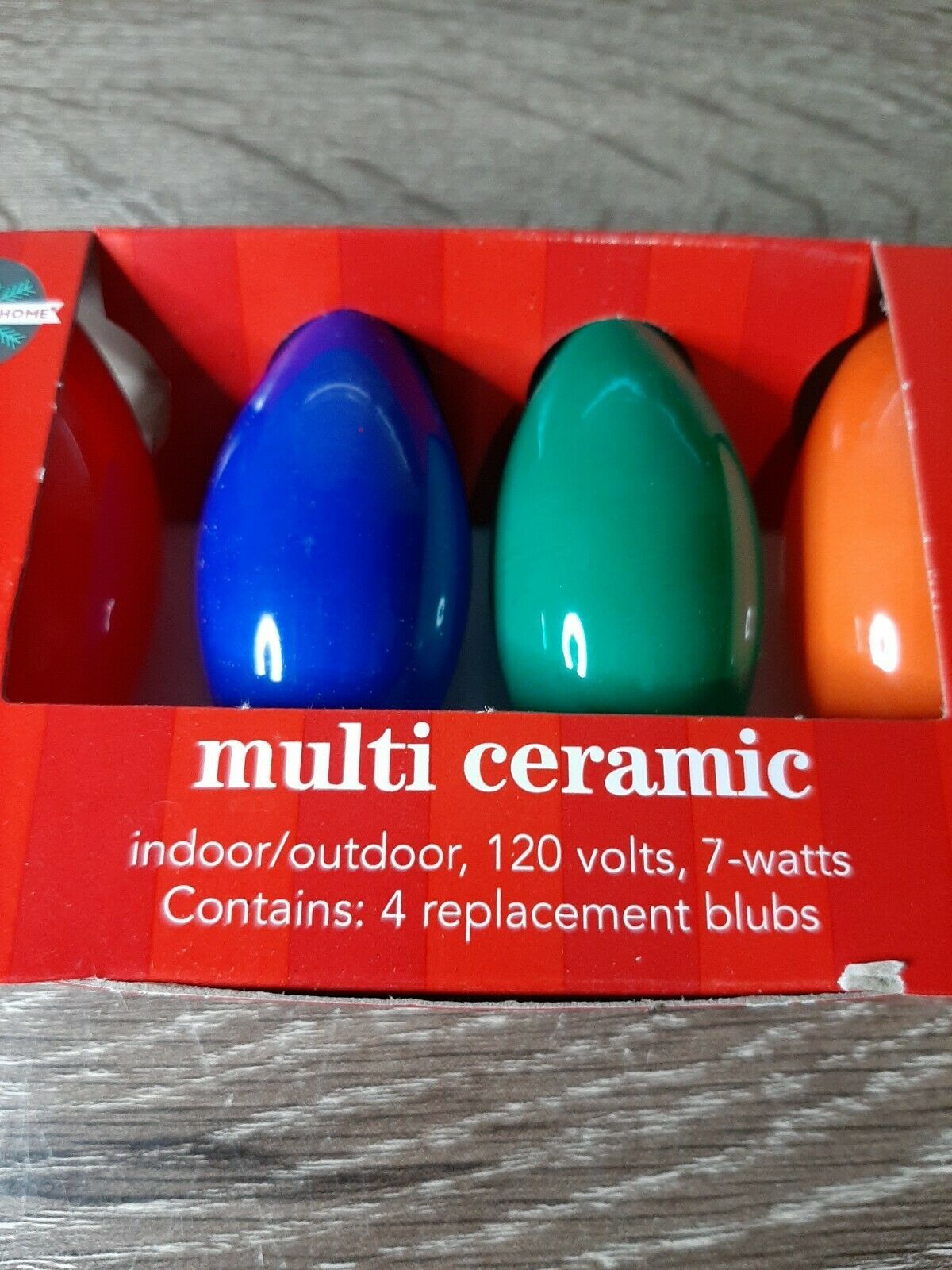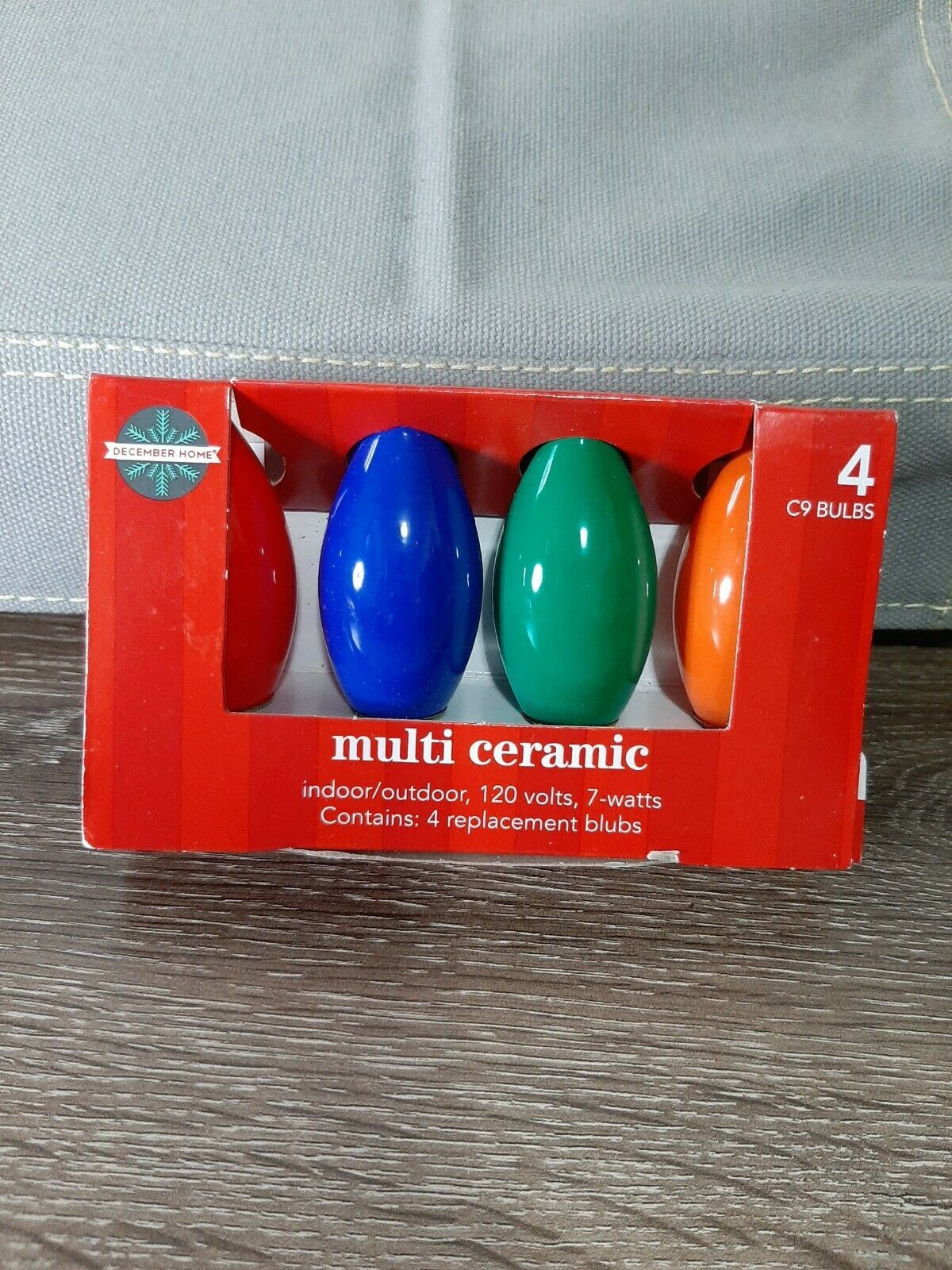 - (1) December Home Multi Ceramic C9 Replacement Bulbs 120 volt 7w bulbs. 4 pack