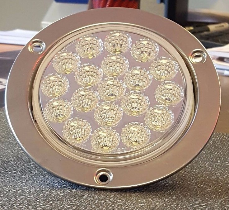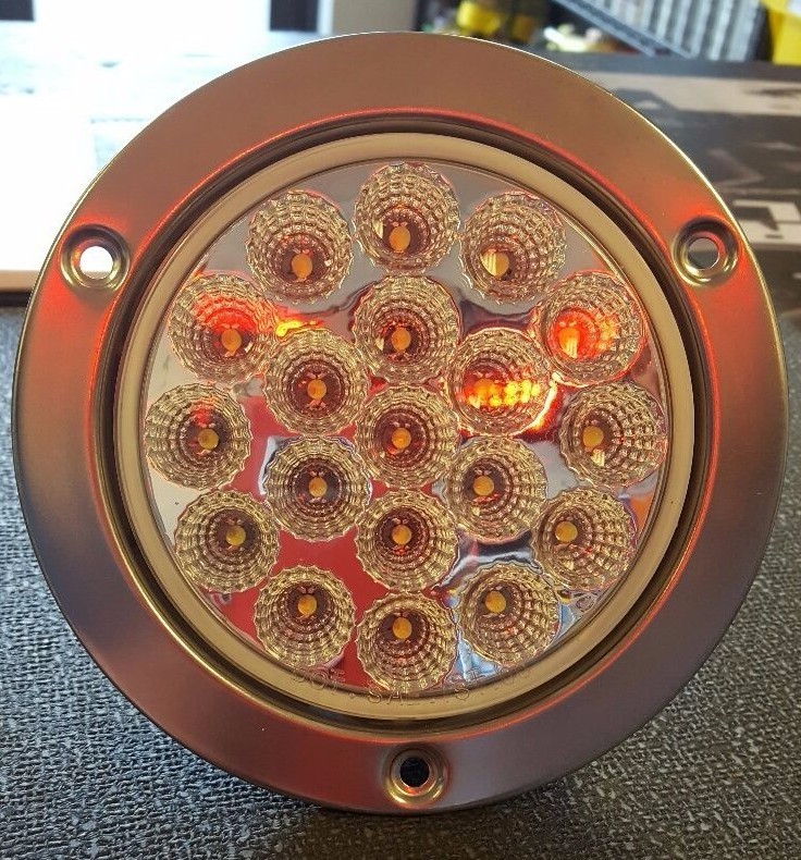 2 Flange mount red stop/turn/tail light with clear lens and a chromed/mirror backed finish. Accepts industry standard 3-prong plug for easy retrofit of incandescent lights. Meets DOT FMVSS 108 requirements in any 360 degree position. 19 diodes for bright, dependable performance. Features sonically sealed, waterproof lens and housing in a single unit. All-weather molded plastic housing and durable lens protect against corrosion.