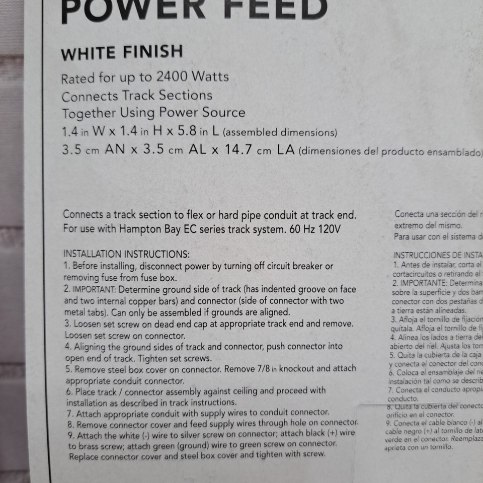 The product is a 2-pack of Hampton Bay track lighting conduit power feed in white. This power feed is designed for indoor use and is rated up to 2400 watts. Made of metal and featuring sealed packs, these track lighting connectors are ideal for powering your indoor lighting fixtures. With a voltage of 120V and an AC current type, these power feeds provide a reliable and efficient power source for your track lighting system.