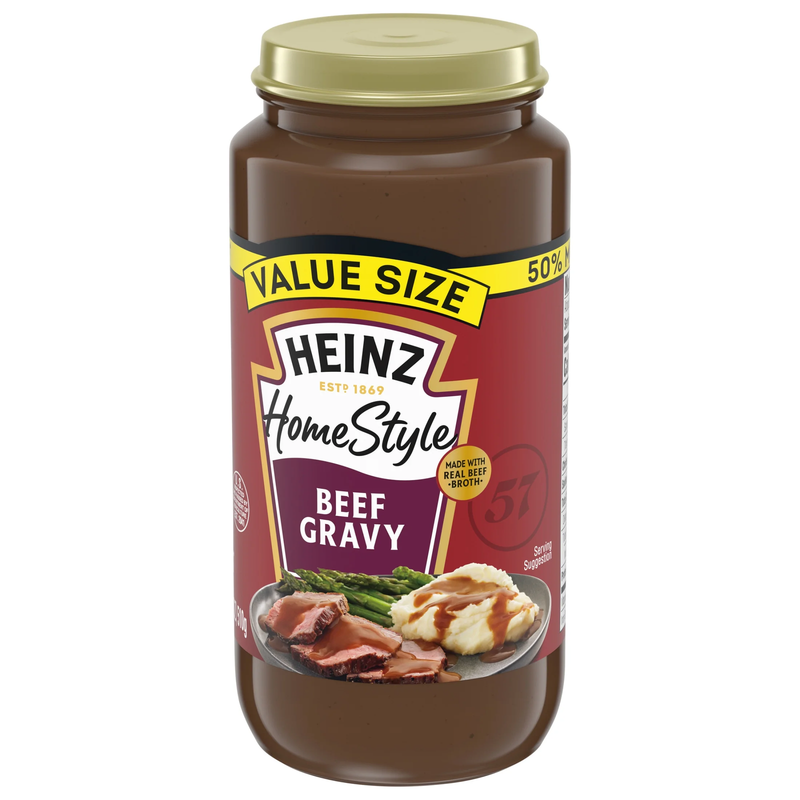 One 18 oz jar of Heinz HomeStyle Beef Gravy With a taste that's as good as homemade, Heinz HomeStyle Beef Gravy enhances your favorite recipe Made with real beef broth Thick and creamy, our gravy is seasoned with the right blend of spices Our beef gravy contains no artificial preservatives Serve with meat or potatoes for a comforting, savory meal Ideal for adding to your pot roast To prepare, simply pour gravy into a microwave safe container, heat, and serve Packaged in a reclosable jar so you can enjoy with leftovers; refrigerate any unused portion after opening and use within 5 days
