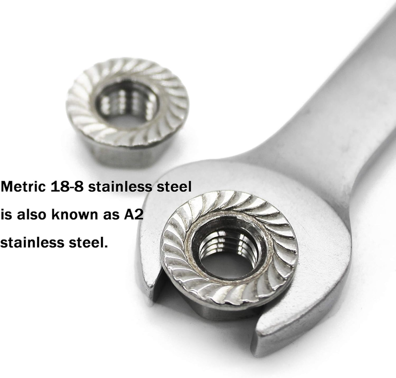 Skip the washer?these metric stainless steel nuts have a flange that does the same job, spreading pressure across its surface for a strong hold.