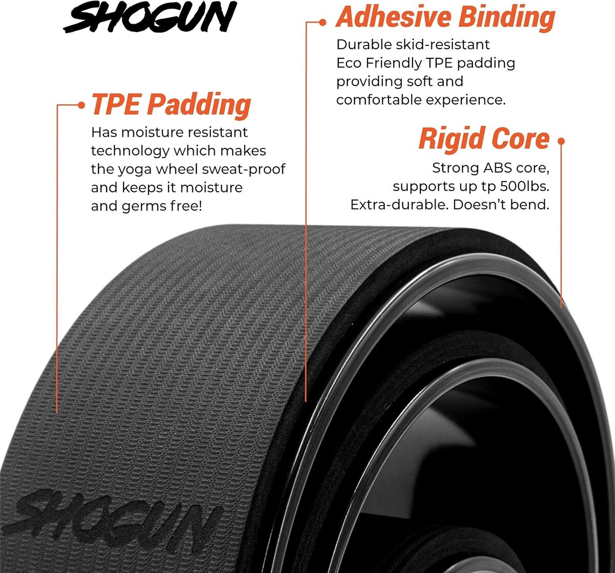 STURDY BUILT TO LAST: The Shogun Sports Yoga Wheel has a durable skid-resistant Eco Friendly TPE padding (3/4? thick) providing soft and comfortable sensation to your palms, shoulders, feet and back. The strong ABS inner core is extremely strong and will support up to 500 lbs, DOESN?T FLEX OR BEND UNDER ANY CIRCUMSTANCES.