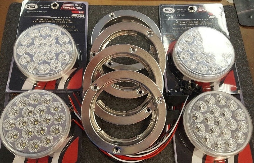 - (4) 19 LED Trux Dual Revolution 4" Round Clear Lens Stop Tail Back-Up Flange Kit