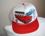 - "65-66" Mustang in 3-D Graphics on a new white mesh Truckers ball cap w/red trim